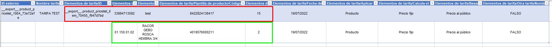 VERDE: Hemos añadido un producto nuevo, sin Elemento de tarifa/ID, por l oque nos creará una linea nueva. El resto de campos los he replicado del de arriba.