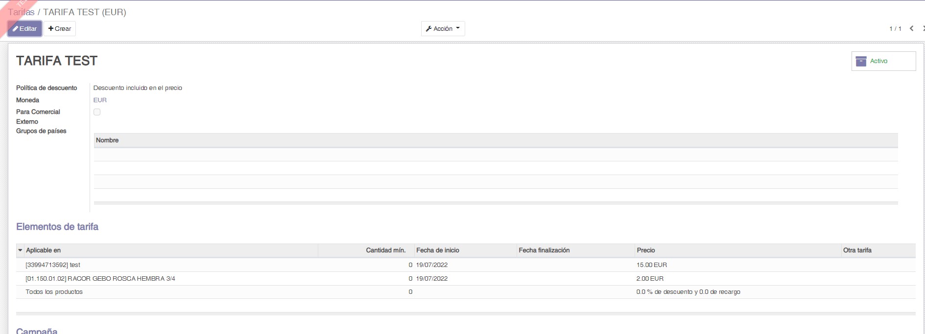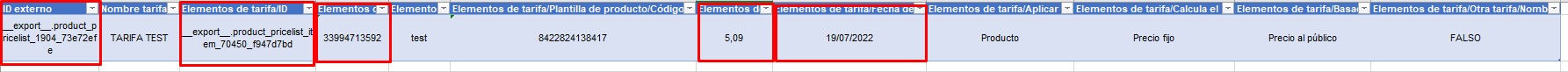 - ID externo: Esta información es la que odoo detecta para poder identificar la tarifa subida al sistema y asi poder actualizar el resto de datos, si esto no se sube a posteriori, nos crearia una tarifa nueva.