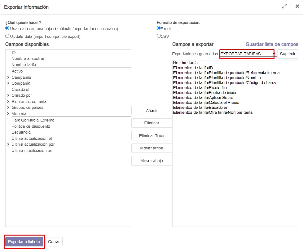 Vamos a actualizar una tarifa. Es importante tener claro que campos son necesarios no perder para poder hacer dicha actualización.