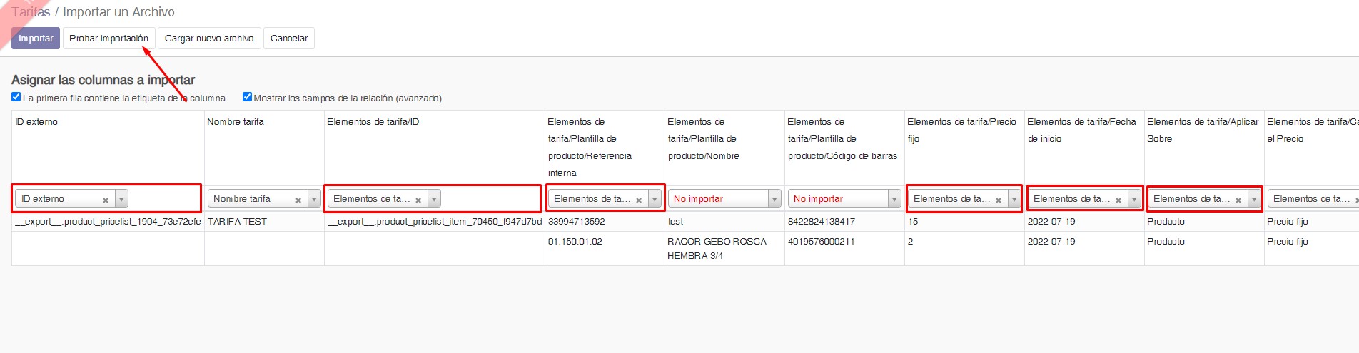 Deben estar si o si los campos remarcados en rojo, para asegurarnos de que no haya errores. Una vez hecho este paso, debemos dar a «Probar importación», señalado en la flecha.