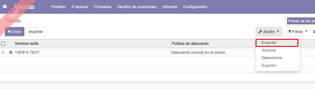 Lo primero que haremos será exportar la tarifa que nos interese actualizar. Ventas<Productos<Tarifas