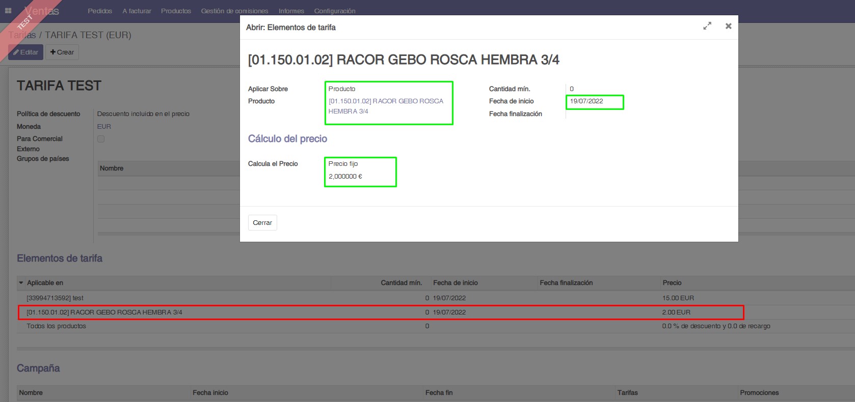 - Elementos de tarifa/Precio fijo: Es el precio del producto (SIN IVA).
