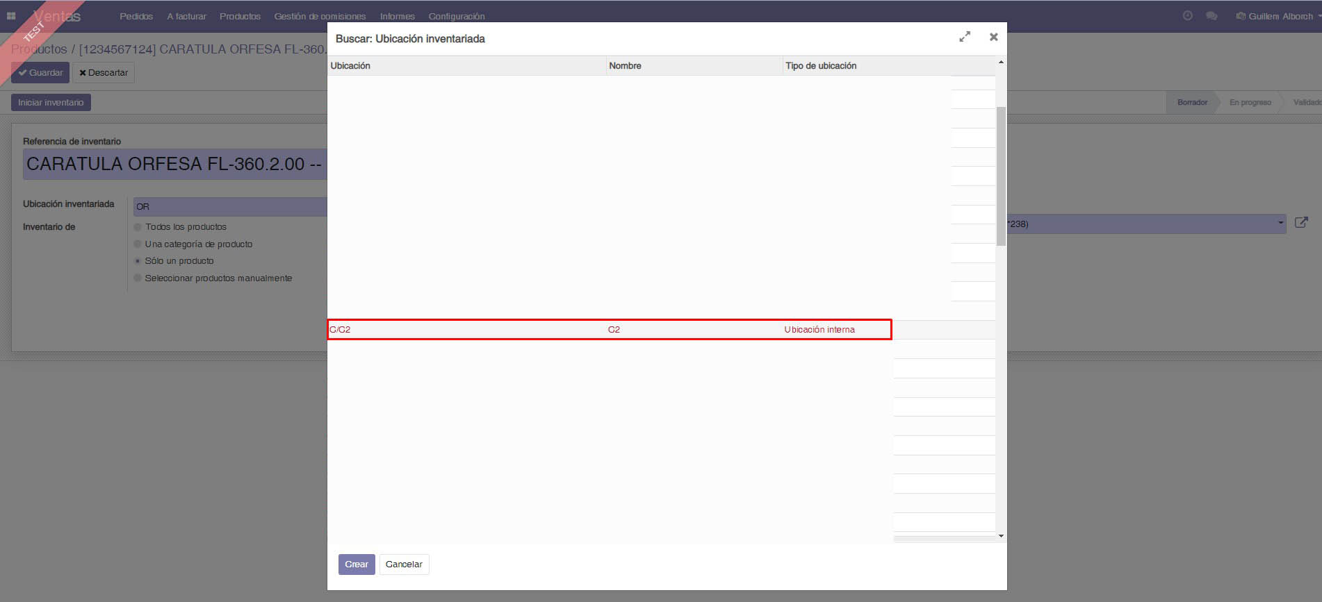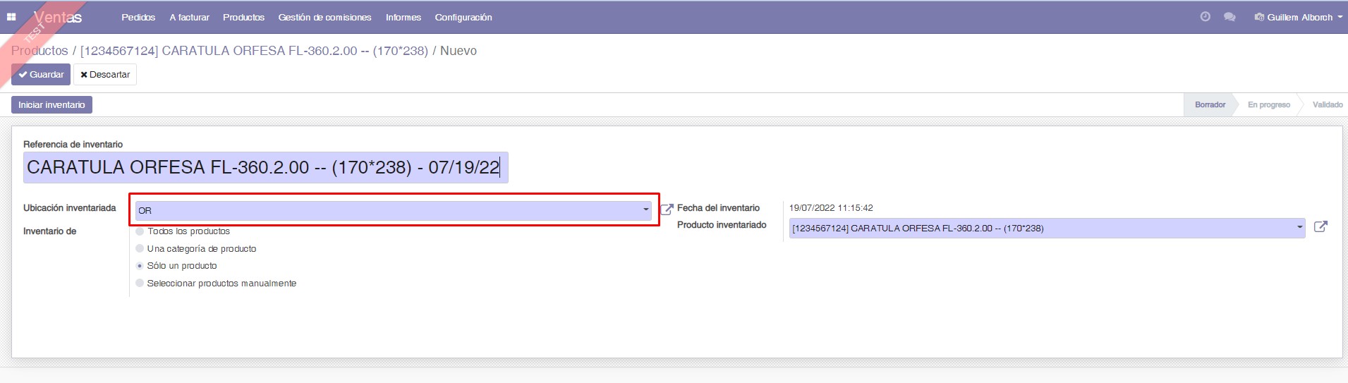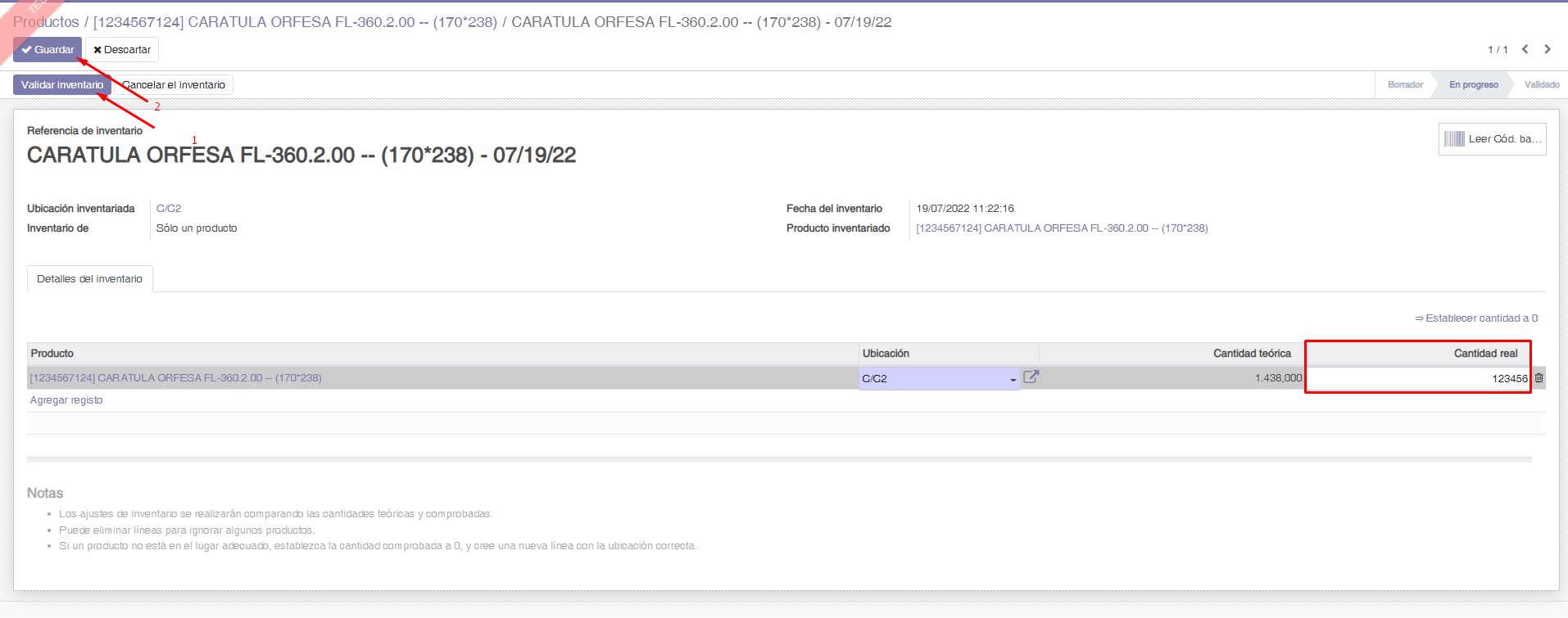 Vemos que la ubicación está correcta, donde el cuadro rojo añadimos la cantidad que nos han pedido (esta es de muestra), acordemonos de sumar los que nos han pedido con los que ya hay en stock.