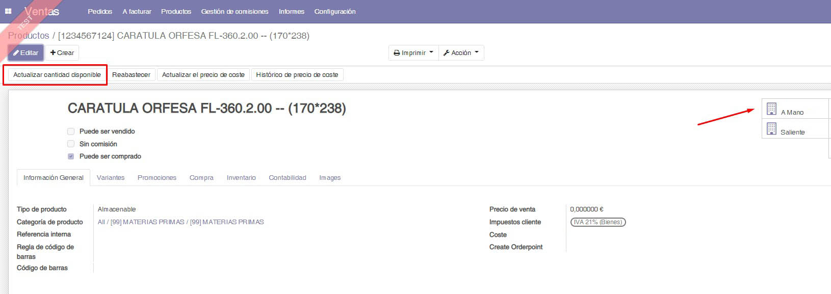Donde señala la flecha nos sale el stock que hay en almacen, ese dato lo usaremos al final para contrastar. Ahora le daremos al recuadro rojo.